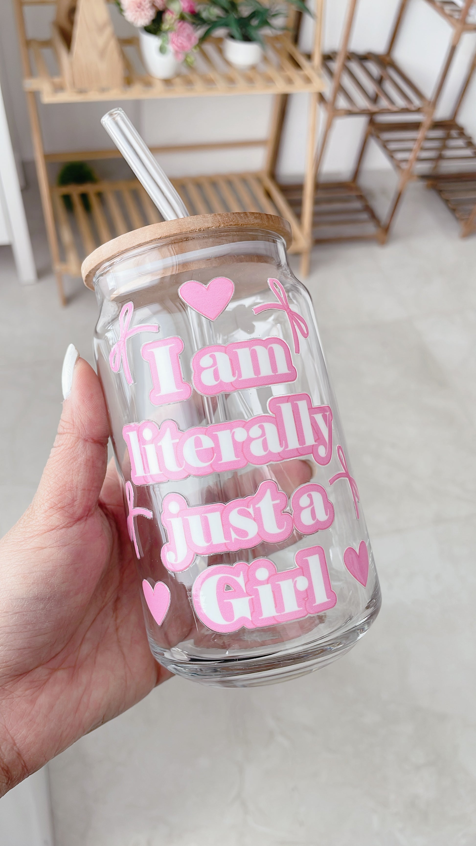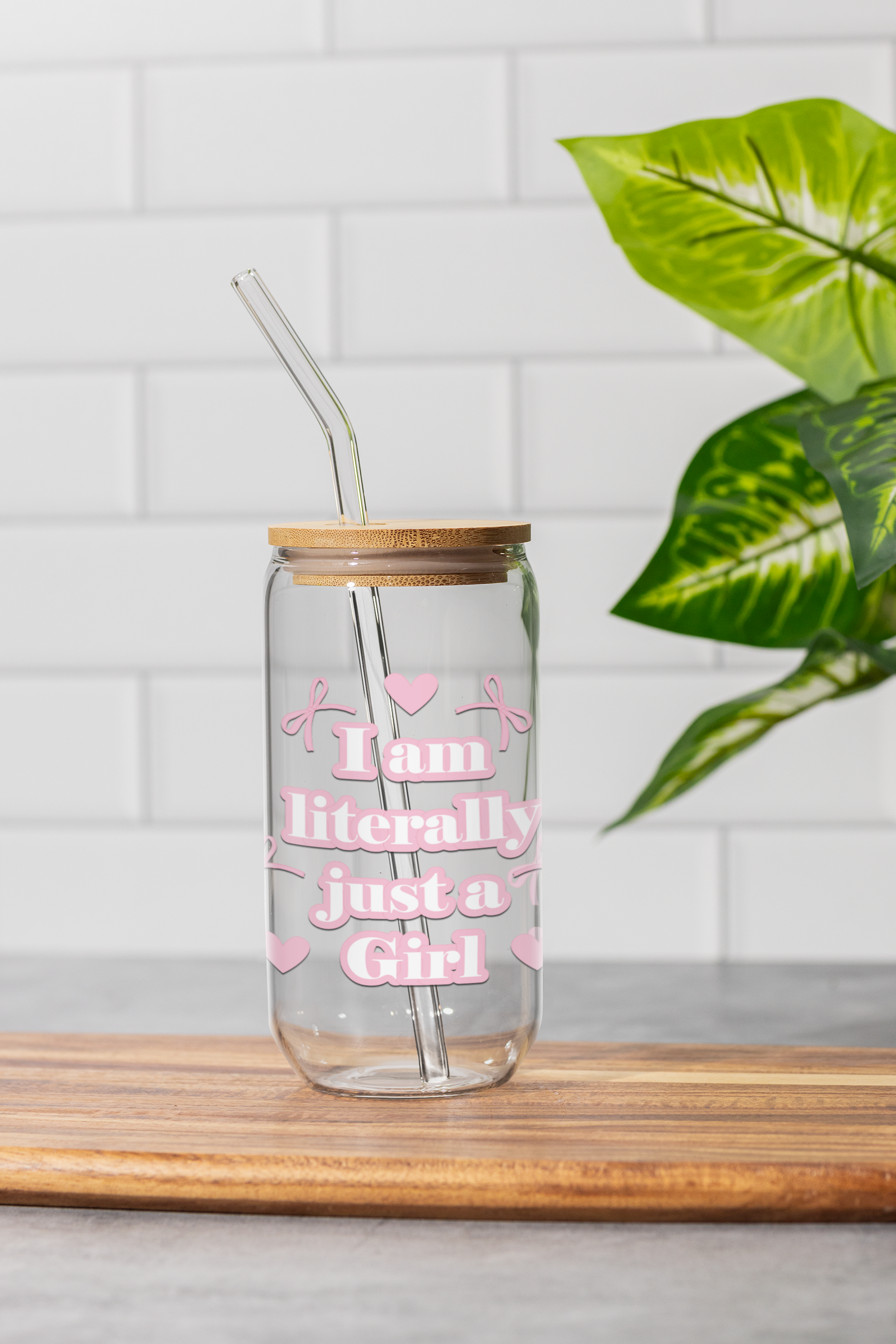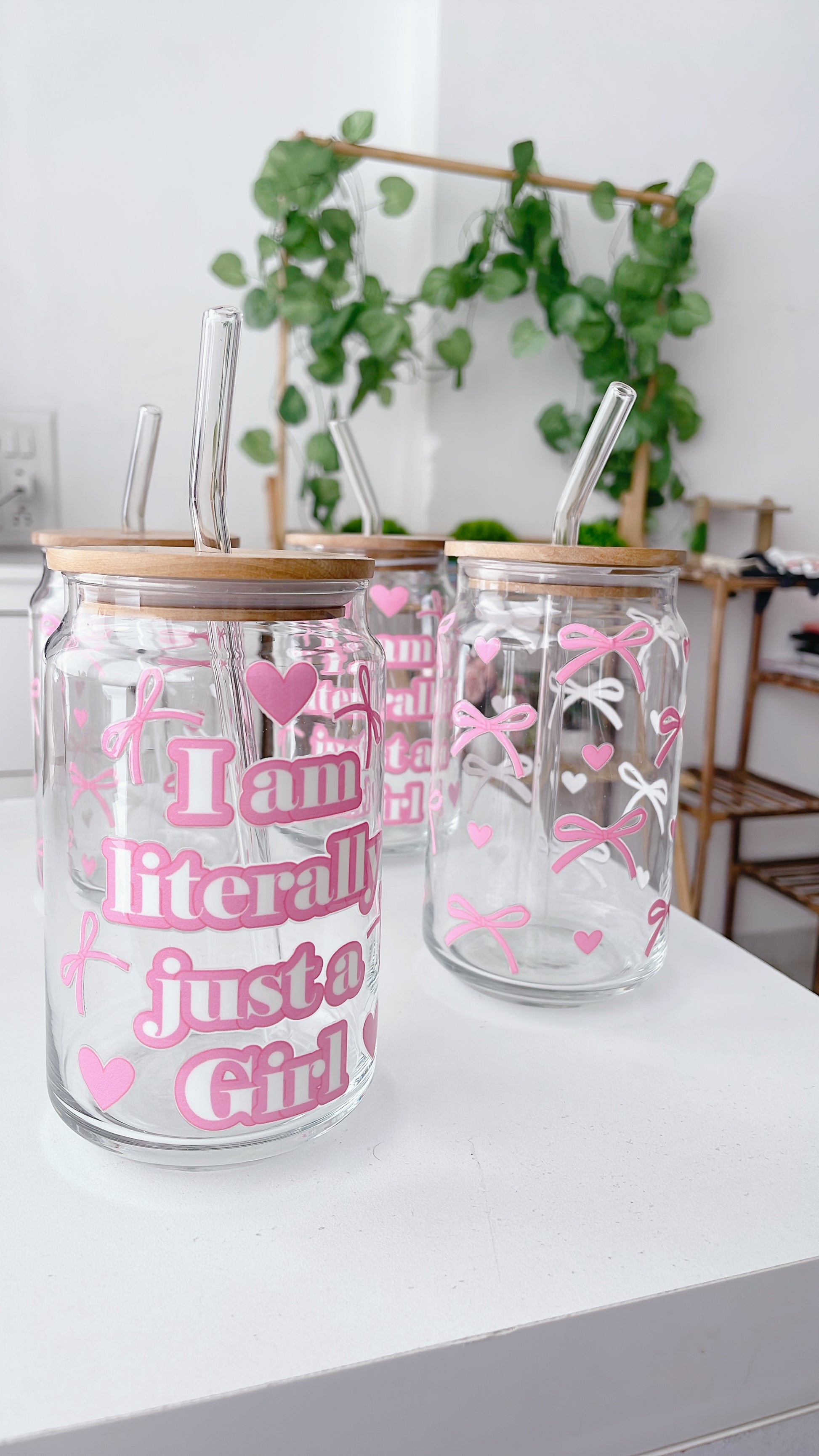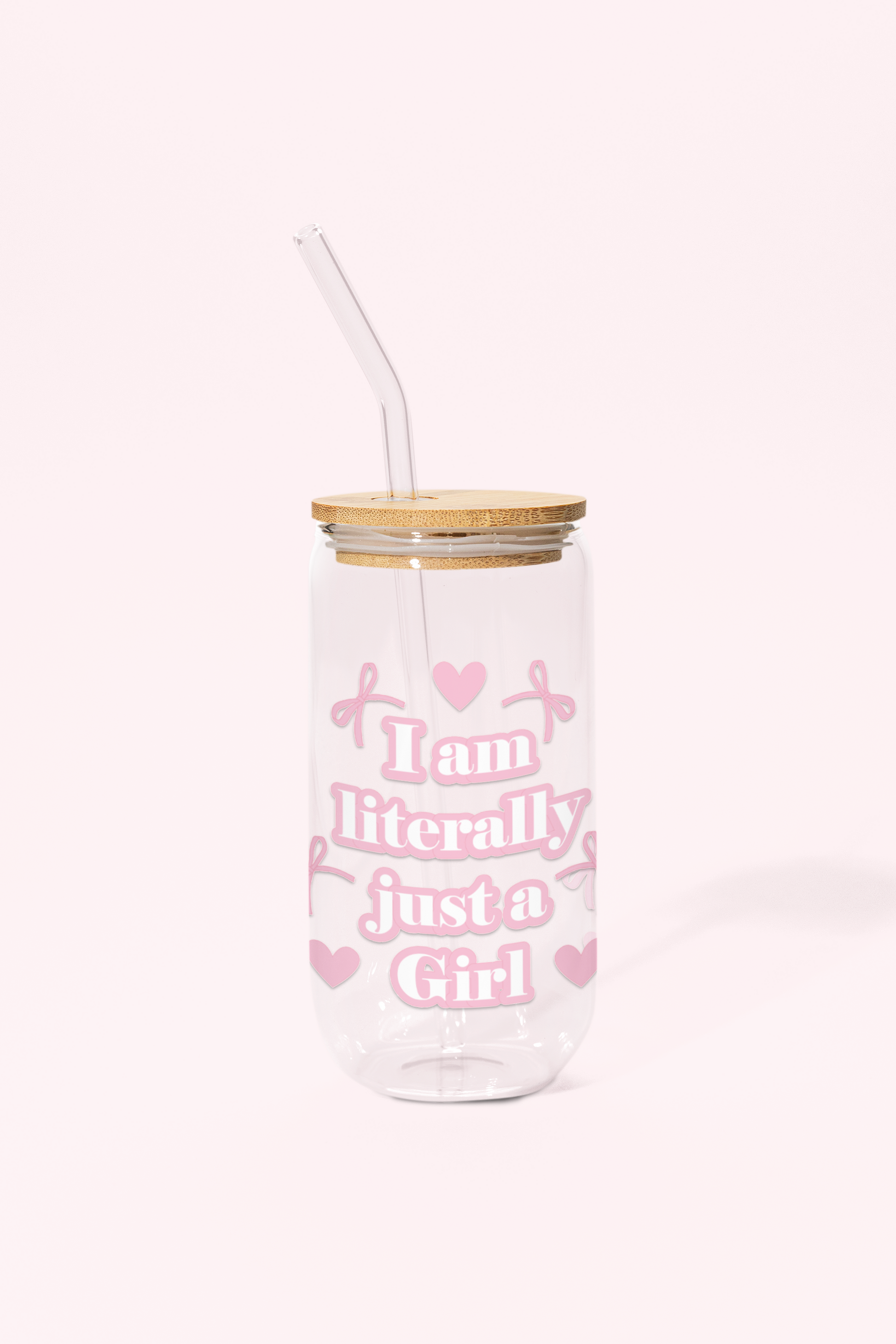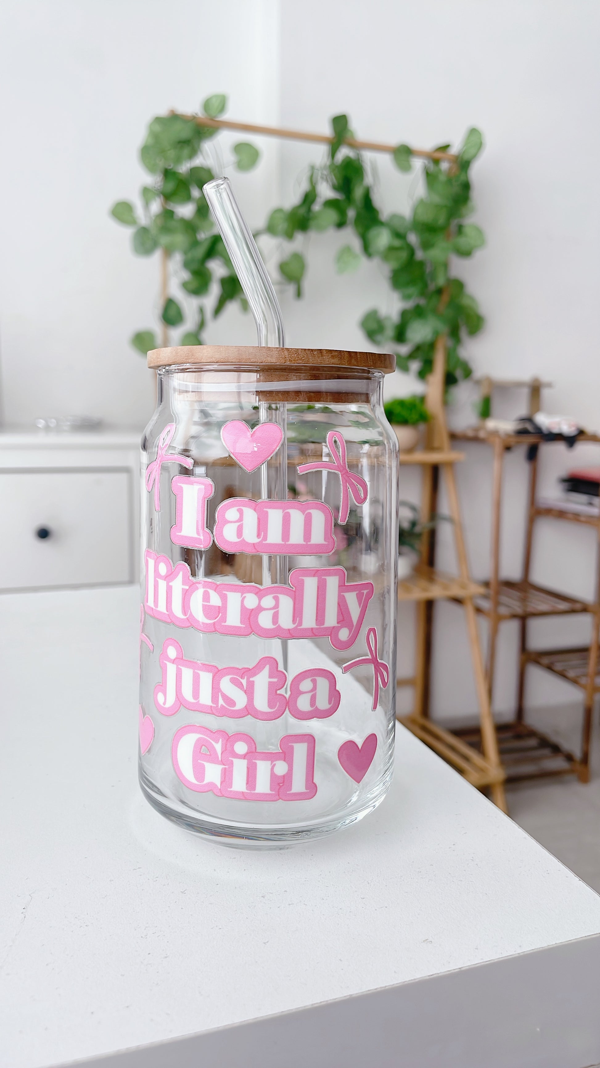 Just a Girl Glass Can Tumbler with bamboo lid & glass straw | 540 ml