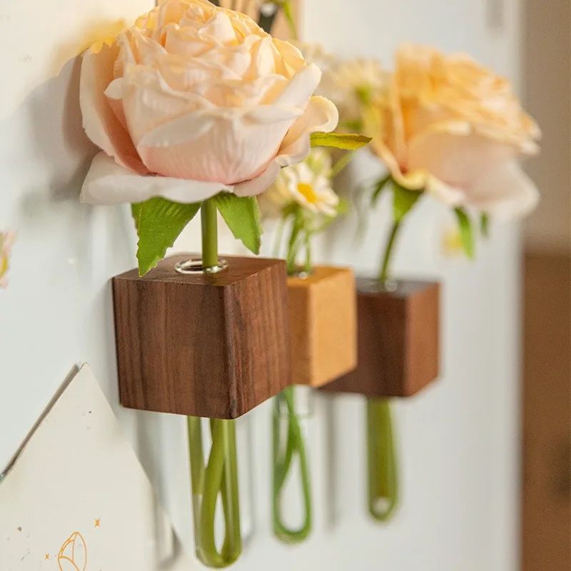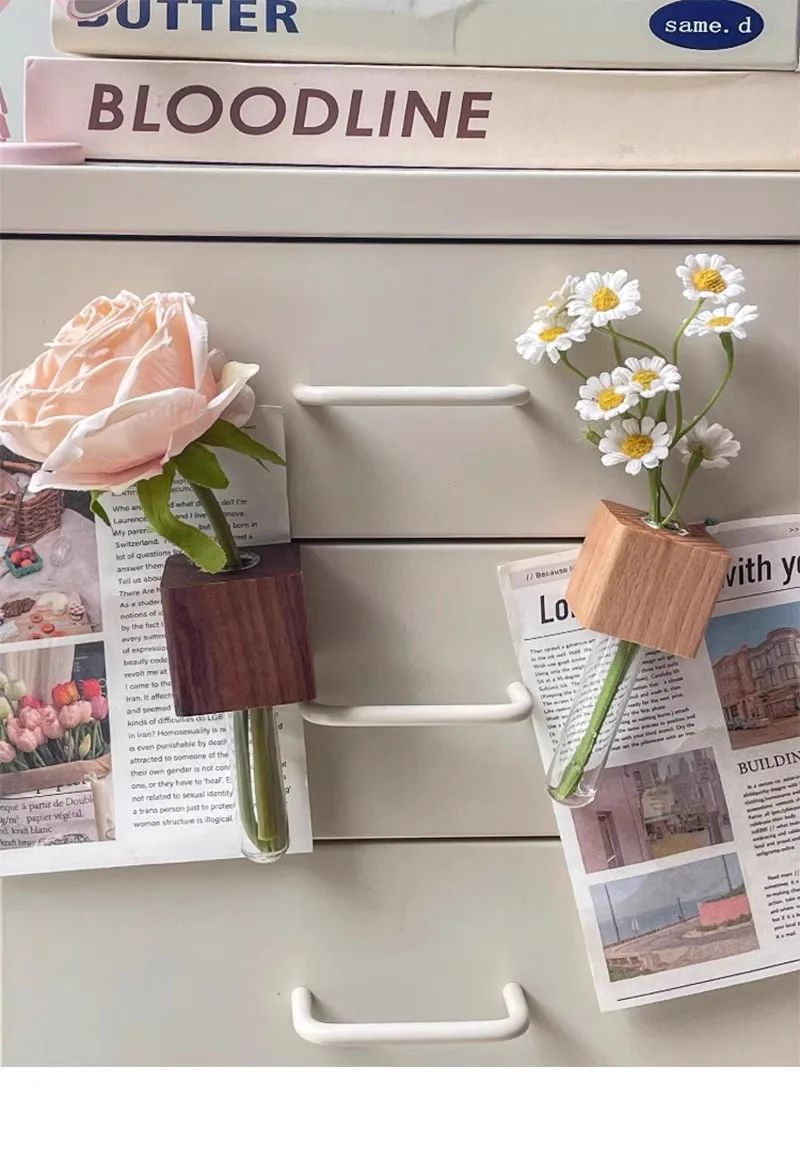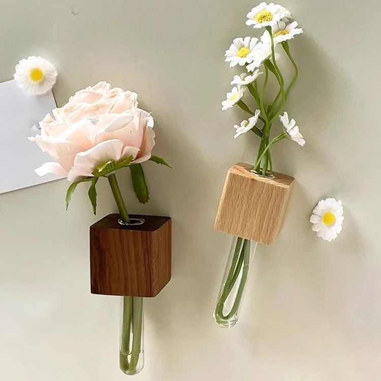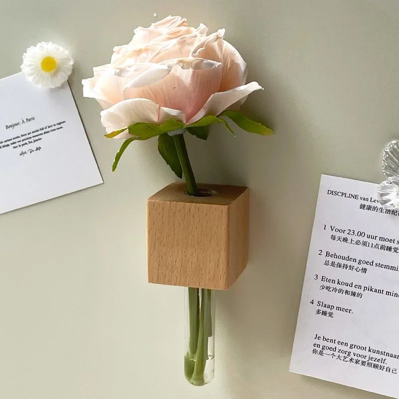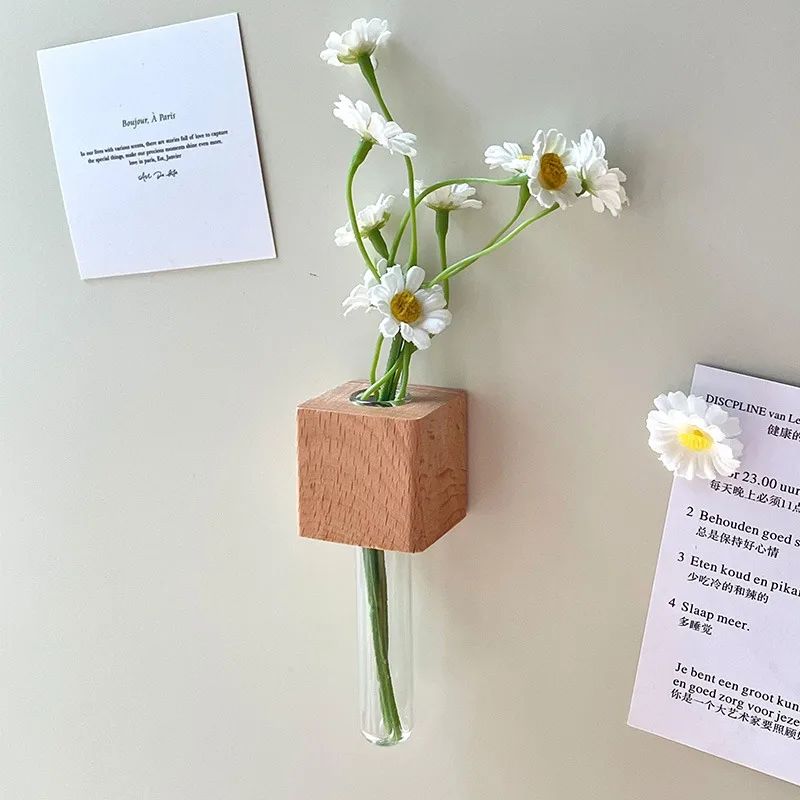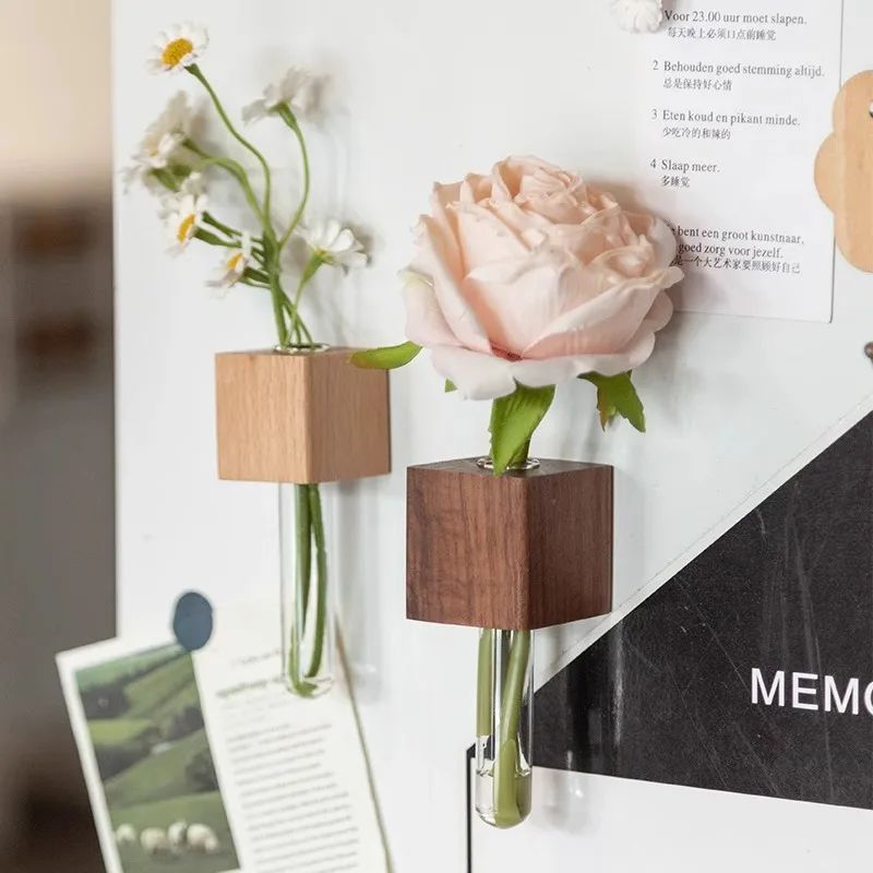 Elevate your décor with this minimalist magnetic wooden flower vase, a perfect blend of natural wood and clear glass. Designed as a fridge magnet flower pot, it holds fresh blooms or dried stems while saving counter space. The strong magnet adheres to refrigerators, metal doors, or magnetic boards, creating an effortless Pinterest-worthy wall garden. Ideal for small apartments, cozy kitchens, or office cubicles, this Scandi-inspired wall planter adds warmth and greenery to any corner. Just pop in a single rose, daisy, or dried sprig for an instant touch of modern rustic charm.