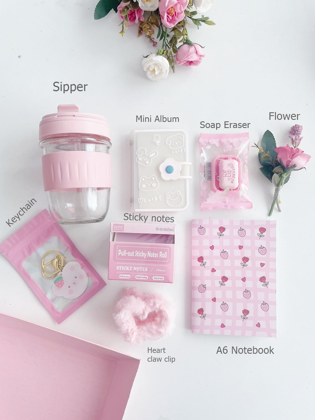 A sweet tray filled with charming pink-themed stationery and lifestyle goodies: