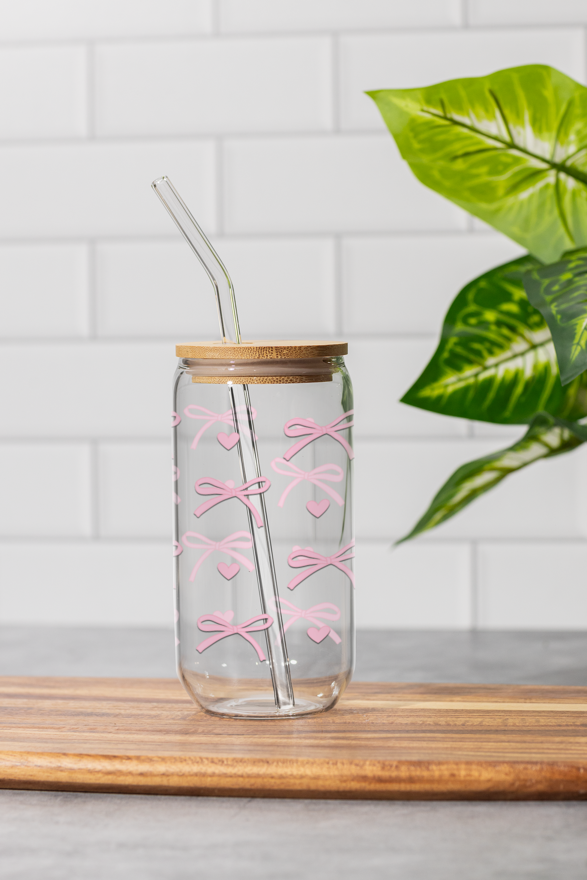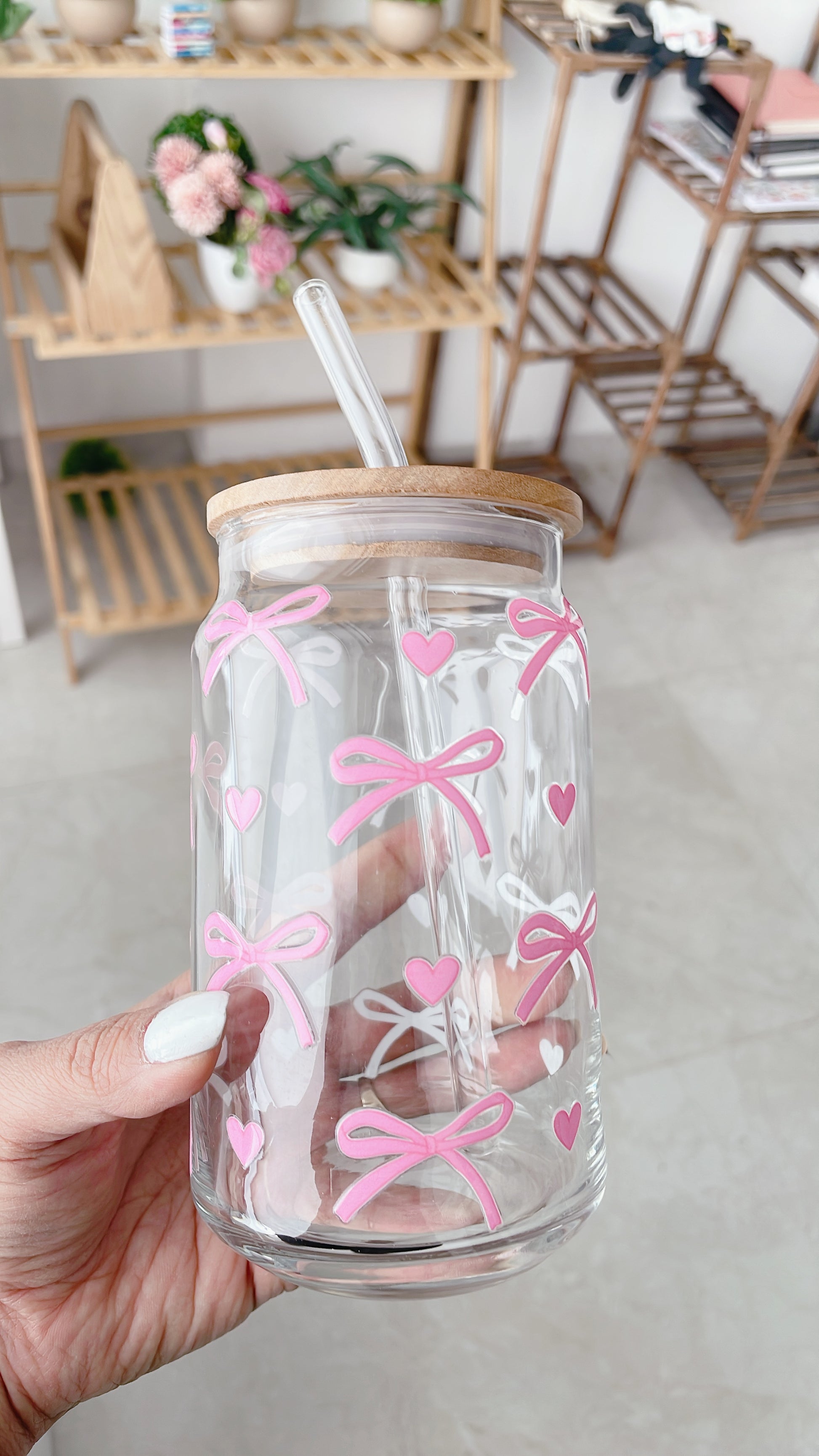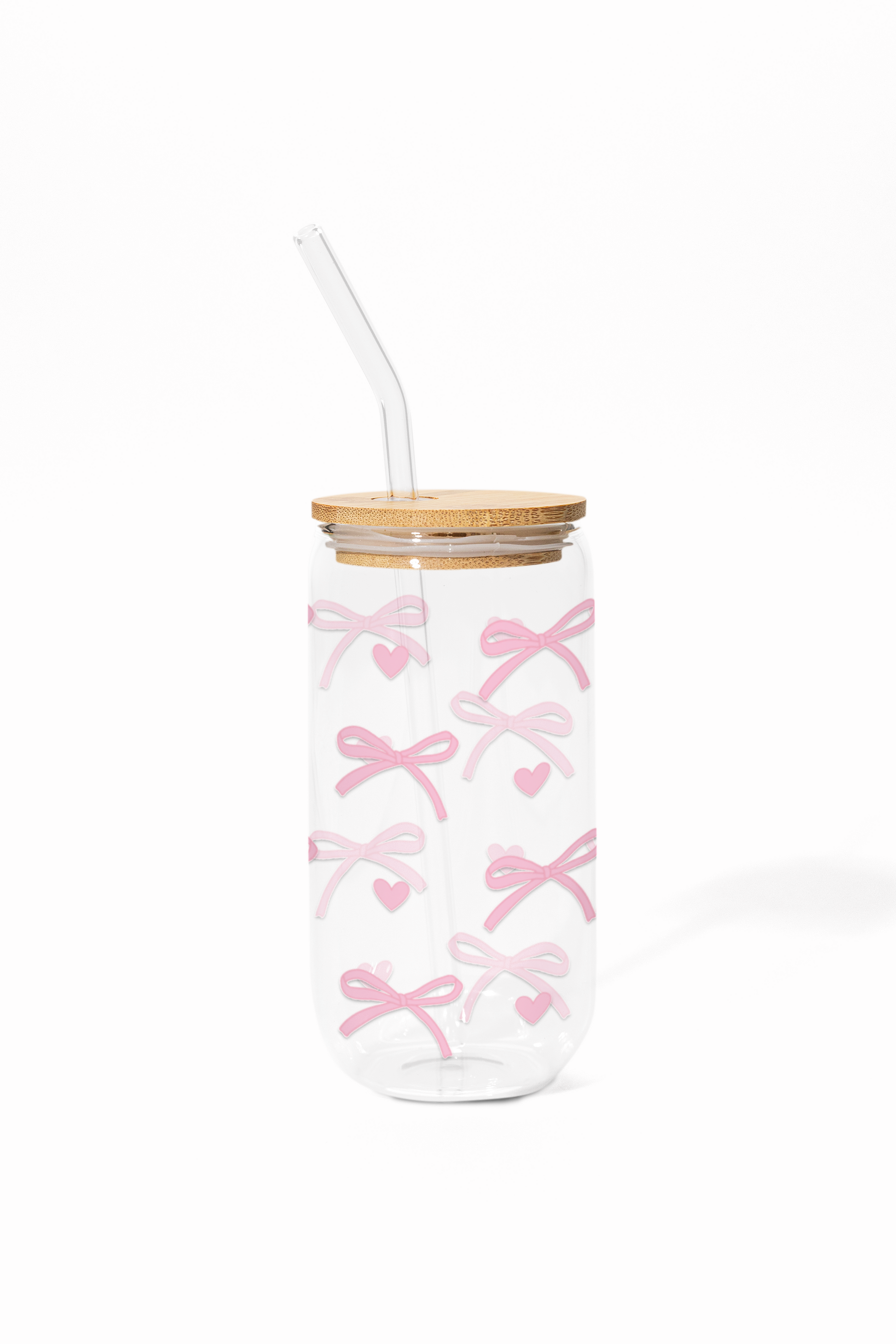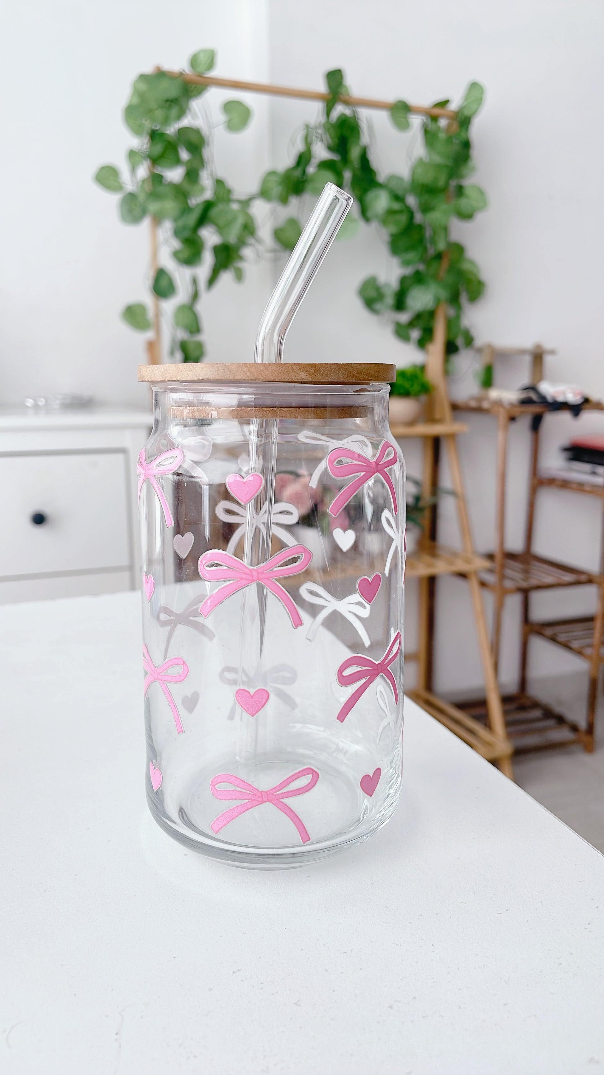 Coquette Love Glass Can Tumbler with bamboo lid & glass straw | 540 ml