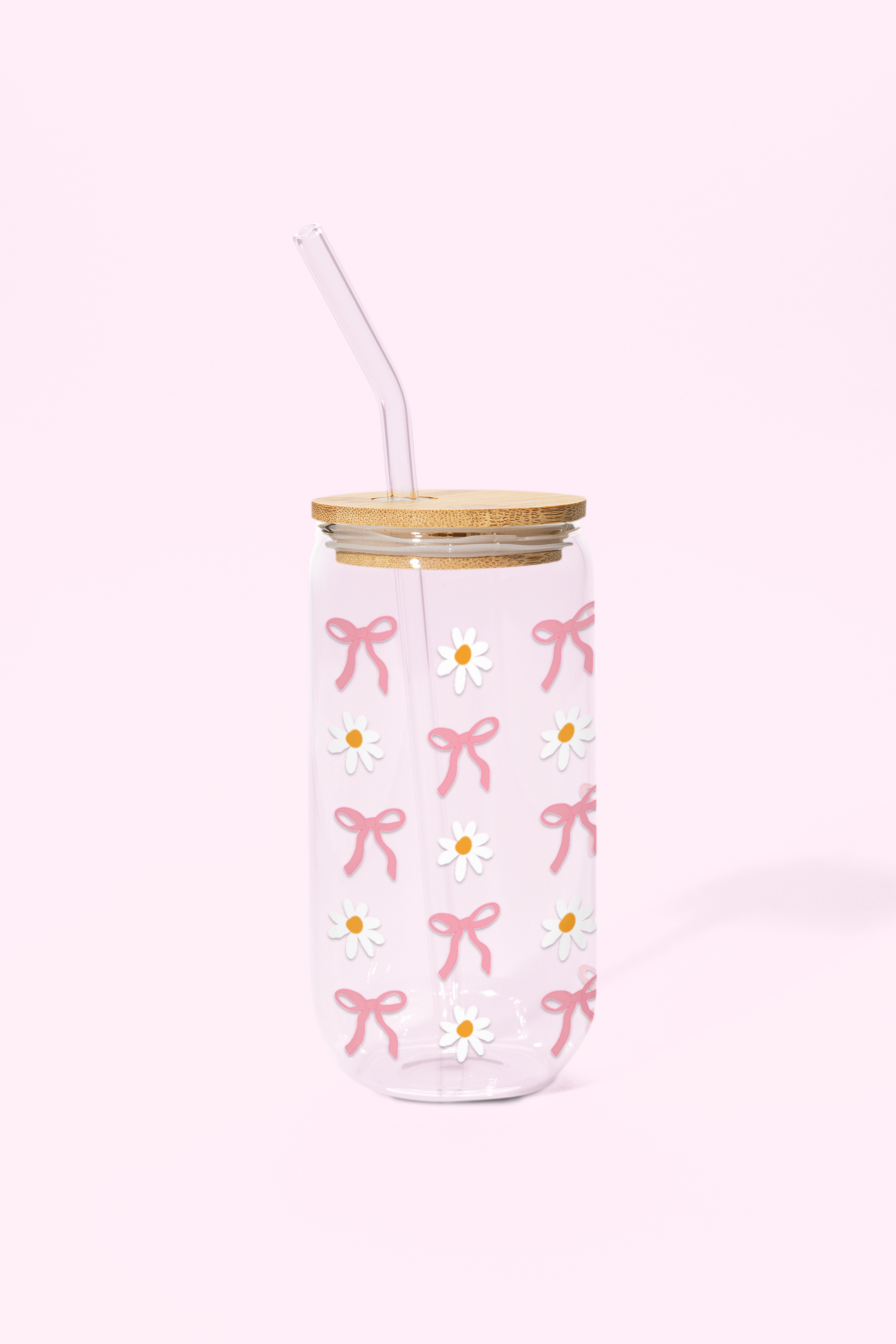 Ribbon Bloom Glass Can Tumbler with bamboo lid & glass straw | 540 ml
